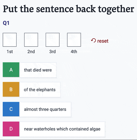 Put the sentence parts in the correct order. Each sentence is in 4 pieces. There are up to 5 questions.